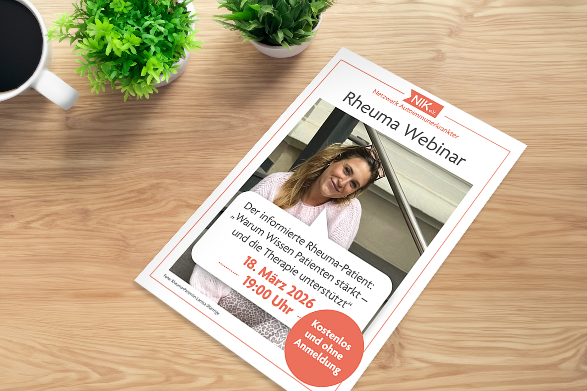 Vom 18. bis zum 29. März 2026 veranstaltet NIK e. V., das Netzwerk Autoimmunerkrankter, die Fokuswochen Rheuma mit abwechslungsreichen Themen zu entzündlich-rheumatischen Erkrankungen. Den Auftakt macht das Webinar Der informierte Rheuma-Patient: Warum Wissen Patient:innen stärkt und die Therapie unterstützt am 18.03.2026 ab 19 Uhr. Die Teilnahme an der einstündigen Online-Veranstaltung ist kostenfrei und ohne Anmeldung möglich.